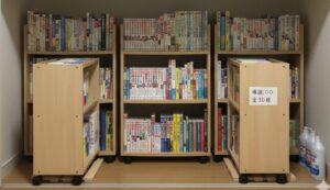 - 蓋つきの収納ボックスを活用する:今あるオープンラックを使い続けたい場合は、本を蓋つきの収納ボックスに入れてから棚に収めるのがおすすめです。シリーズものの漫画や文庫本をまとめて入れ、ボックスにラベルを貼っておけば、ホコリ除けと整理整頓が同時に実現します。